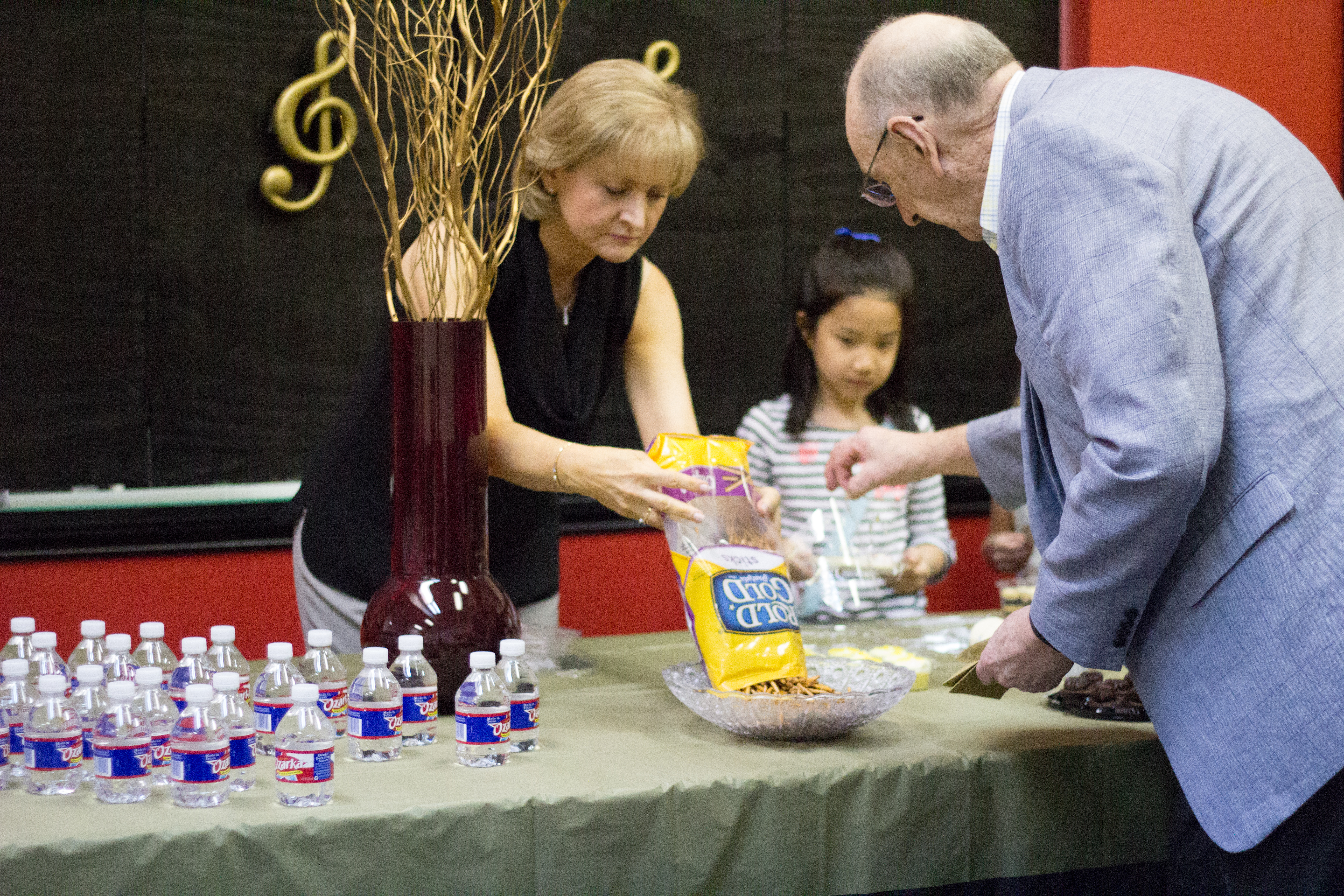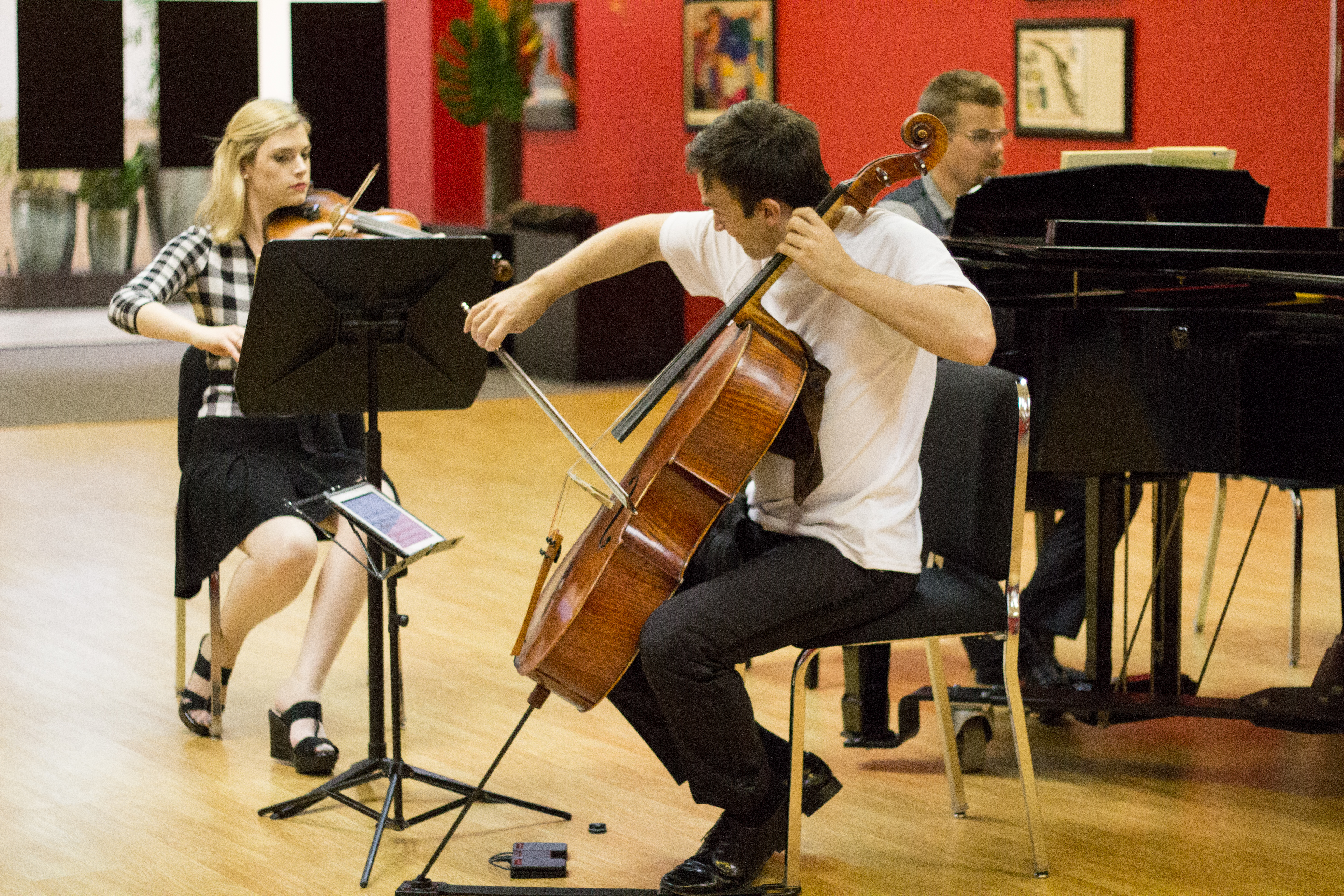 Lauren and Thomas smile during rehearsal with DavidThe daring program included the Franck Sonata, Debussy Sonata, and Brahms Trio in B MajorPretzels are always a good ideaOnce a Suzuki Parent, Always a Suzuki Parent. Lauren’s father sets up audio recording devices during rehearsal.David warms up before tackling the Franck SonataThomas takes on a soaring cello melody in the BrahmsThirsty, anyone?Lauren listens as David takes it away in the BrahmsUp-bow it is then!All together now!Smiles during intermission — is it the cookies, or the music?David chats with LHS Woodlands violinist Frances after the performanceLauren is overjoyed to see her dear friend John (trumpet)Take a bow!