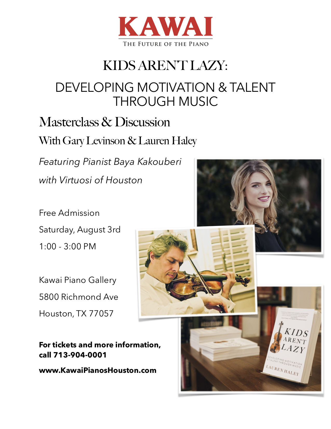 To learn more about Kids Aren’t Lazy: Developing Motivation & Talent Through Music, join violinist Gary Levinson (Senior Principal Associate Concertmaster, Dallas Symphony, and Artistic Director, Chamber Music Society of Fort Worth), pianist Baya Kakouberi (Artistic Director, Blue Candlelight Music Series, and Lauren Haley at Kawai Piano Gallery Houston on Saturday, August 3rd from 1 – 3 pm!